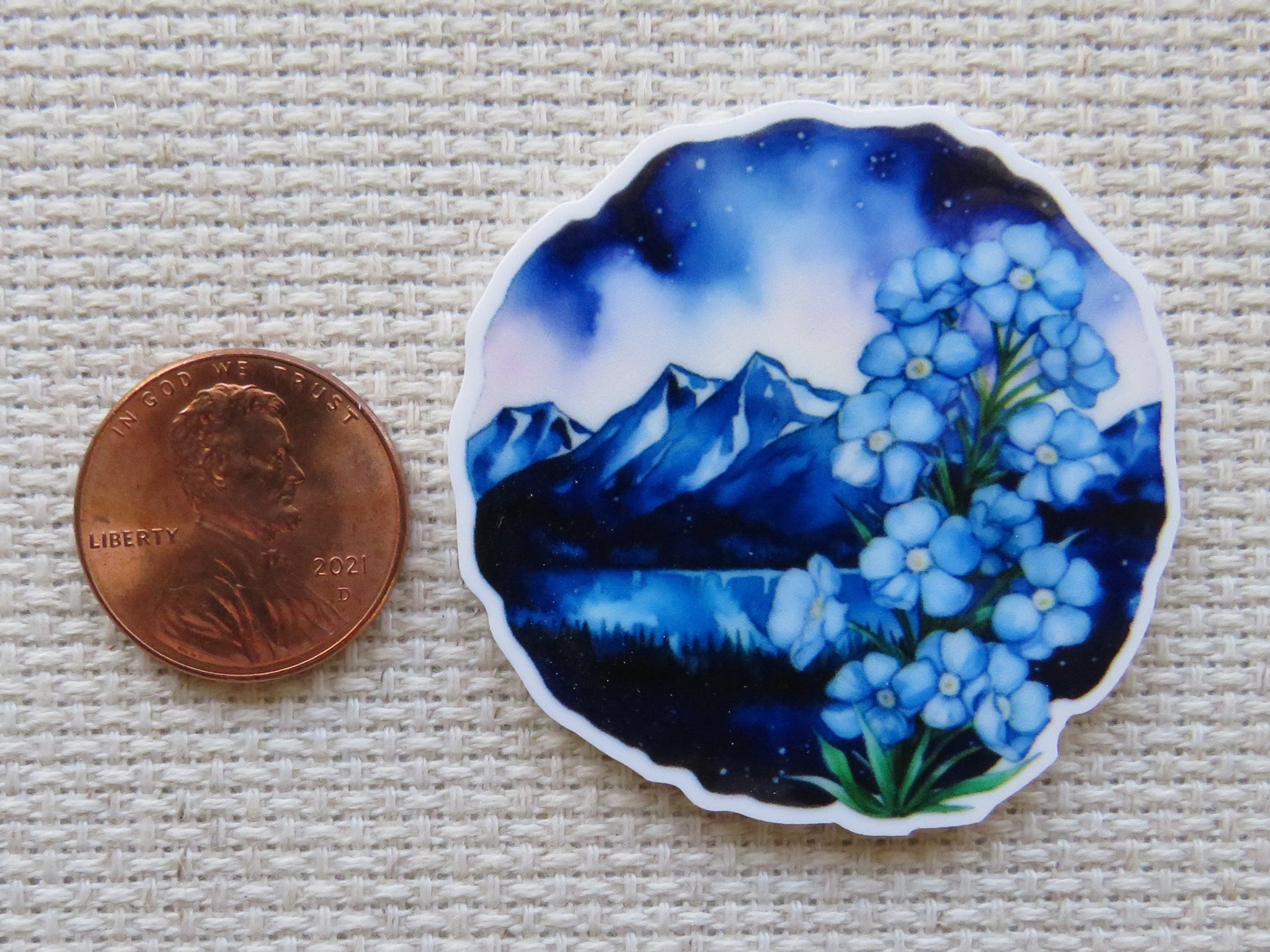 Beautiful Blue Flowers with A Mountain and Lake Scene Needle Minder, Cover Minder, Magnet