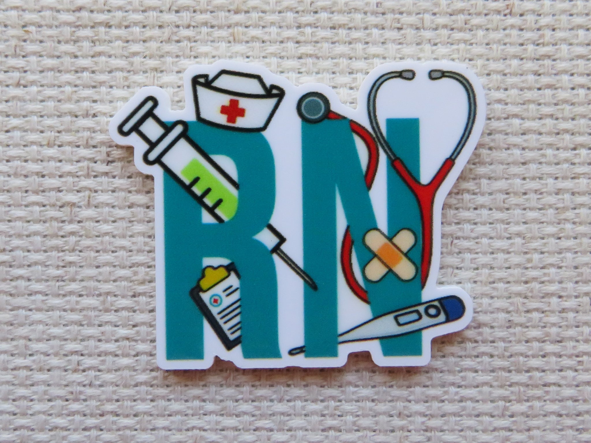 RN in a lighter blue with a nurses hat, stethoscope, clipboard, shot, thermometer, and band aids.