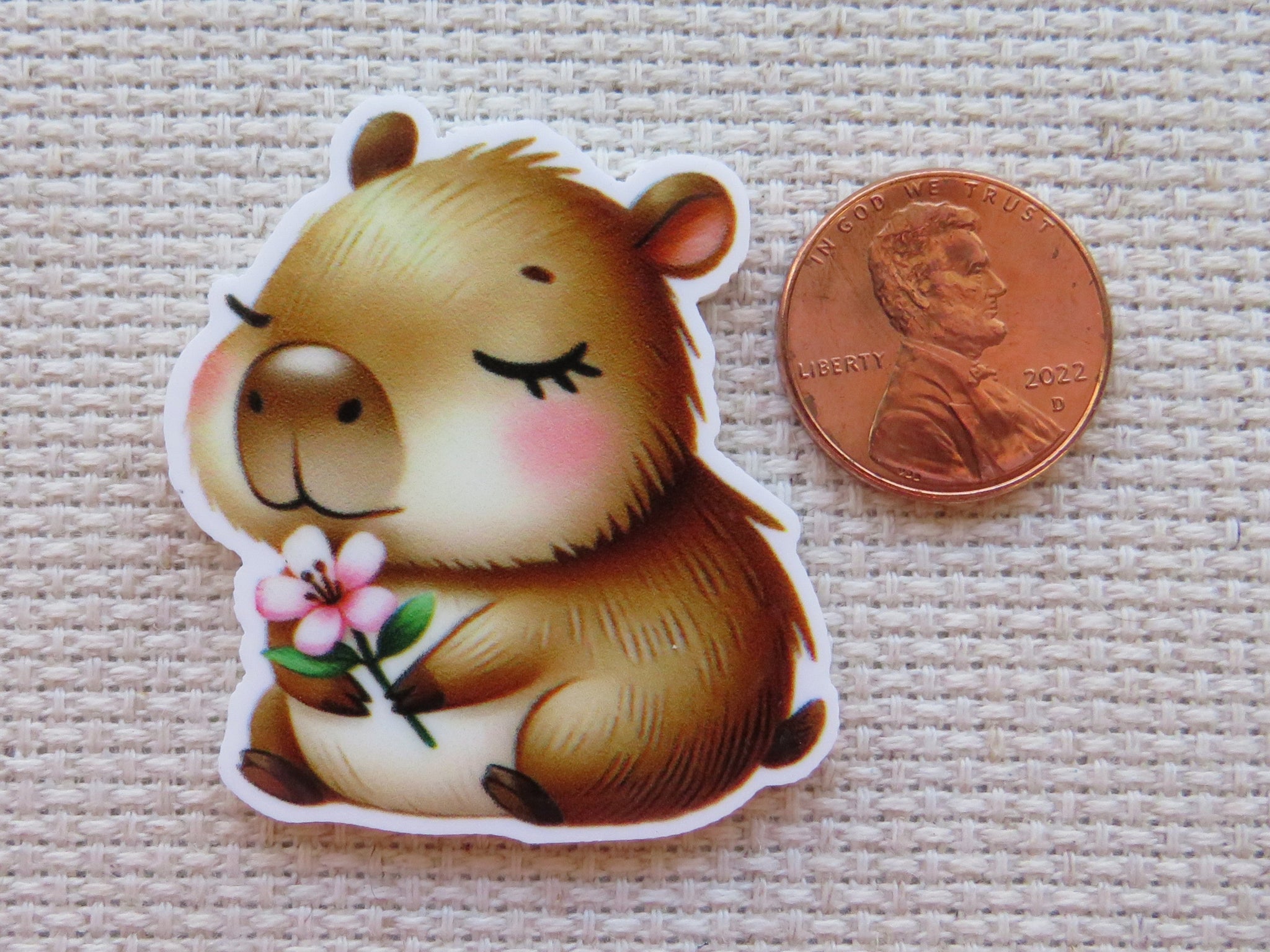 Capybara Smelling a Pink Flower Needle Minder, Cover Minder, Magnet