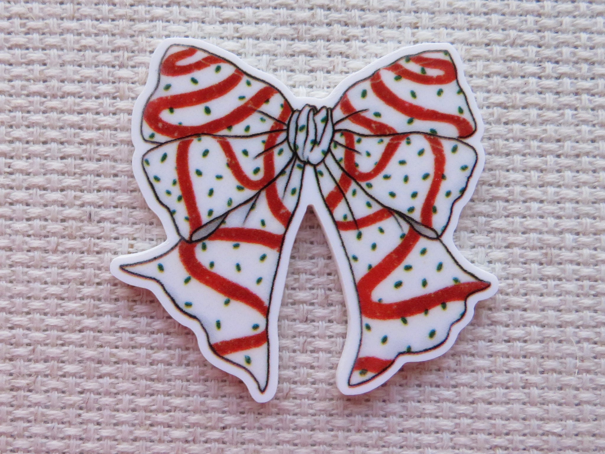 A beautiful bow depicting the white and red frosting of a special Christmastime treat.