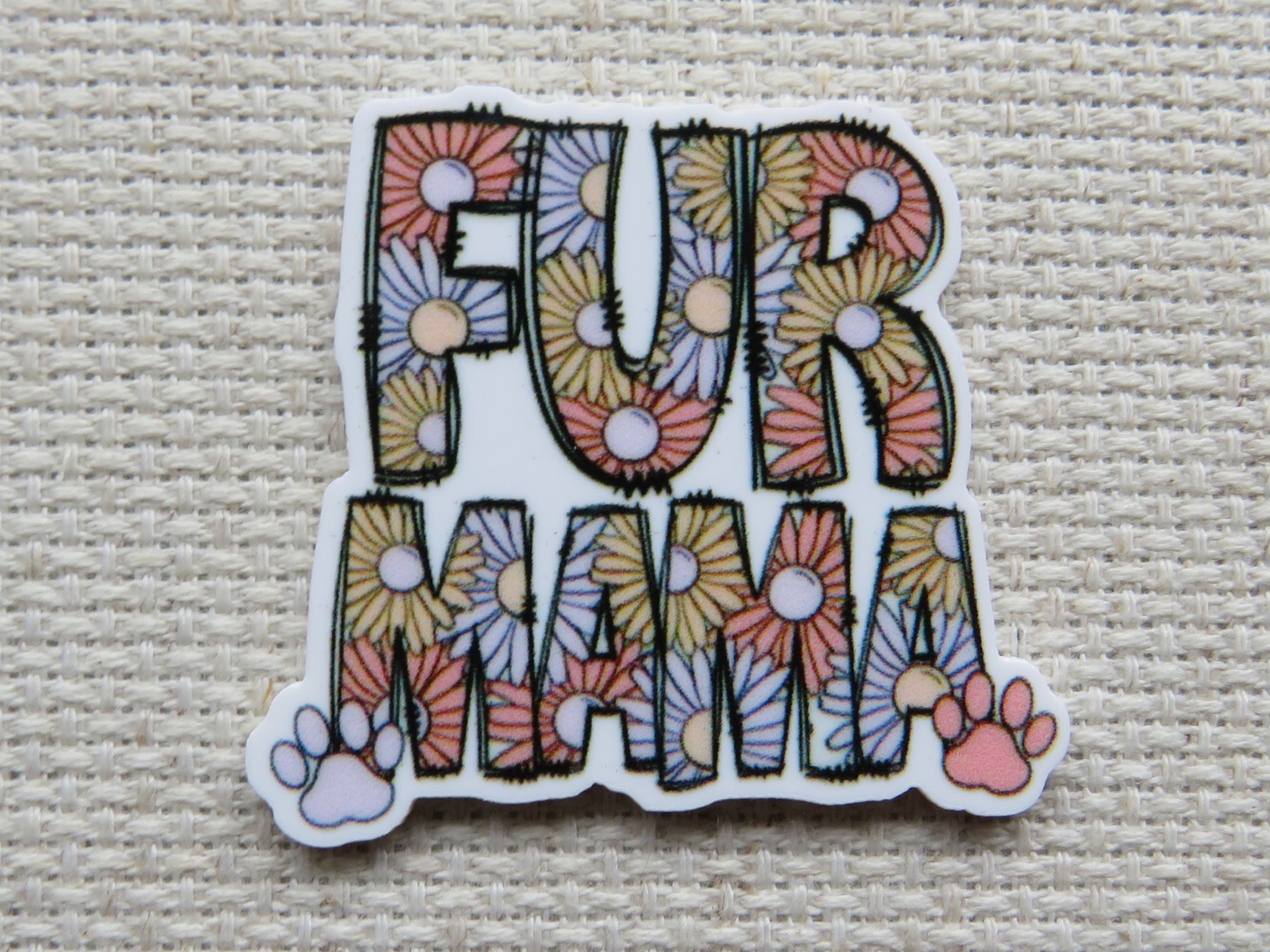 Fur Mama in colorful daisy letters with pawprints.