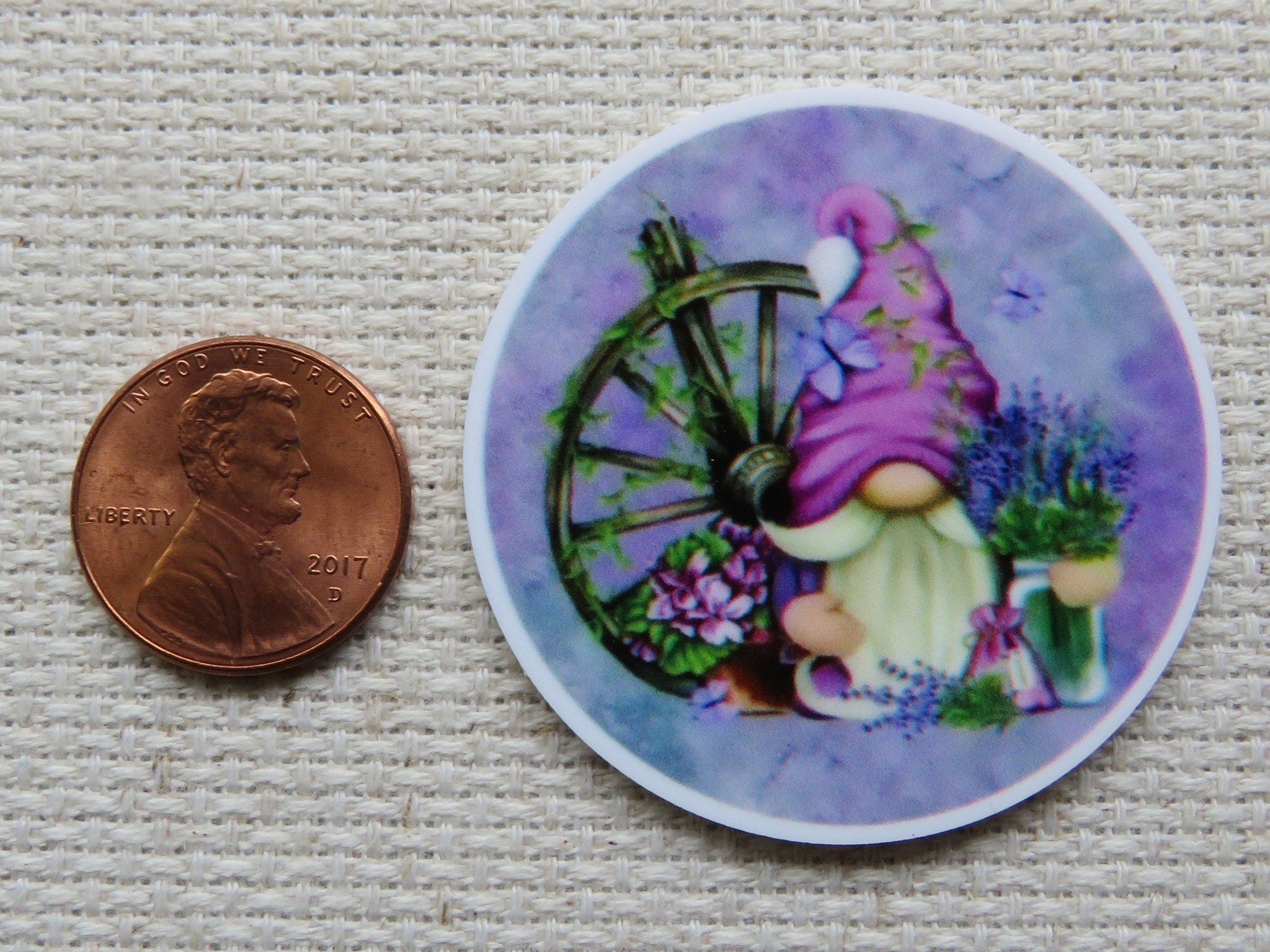 Pinkish purple gnome in a purple circle with a wagon wheel and a vase of lavender flowers.