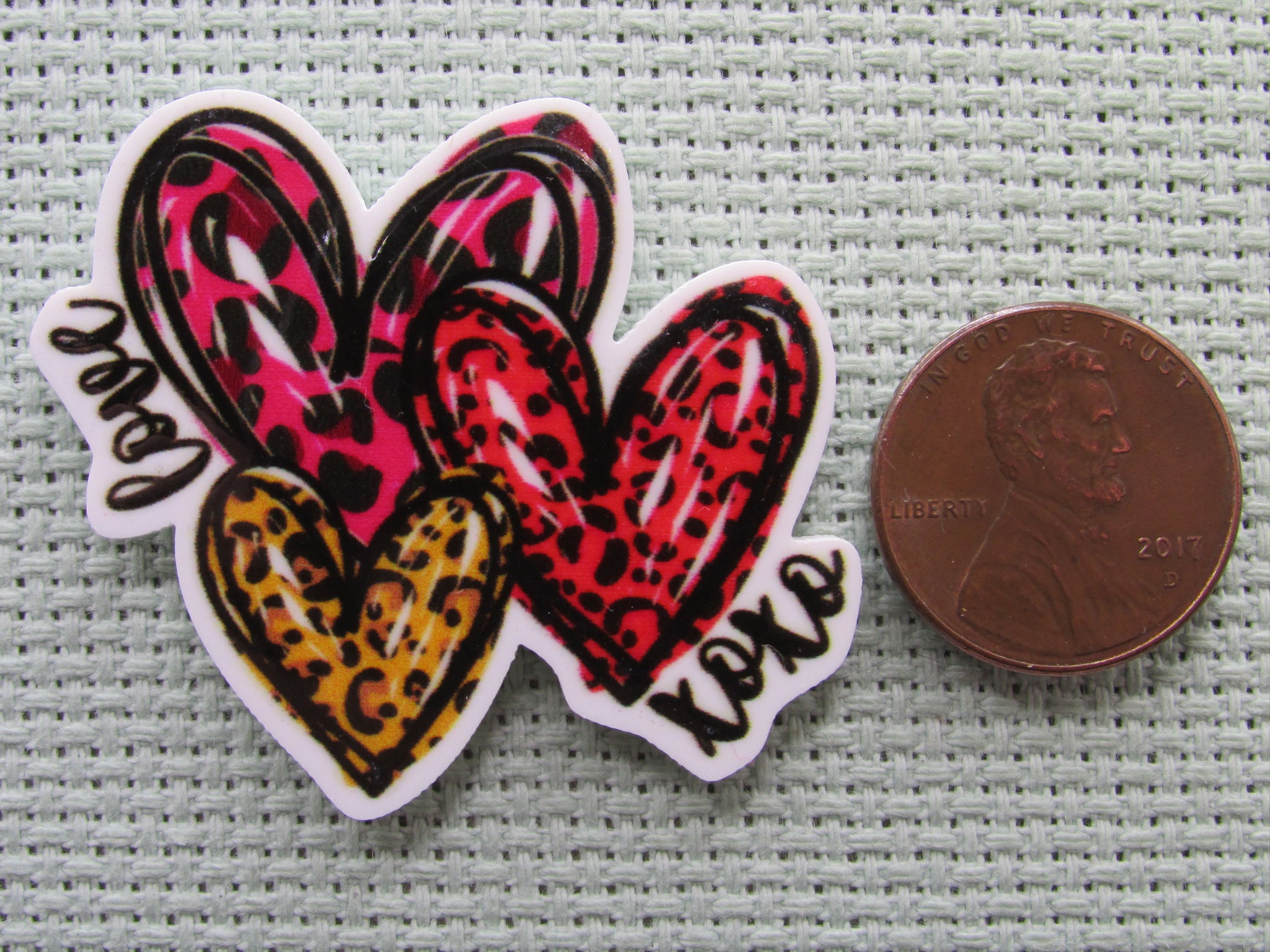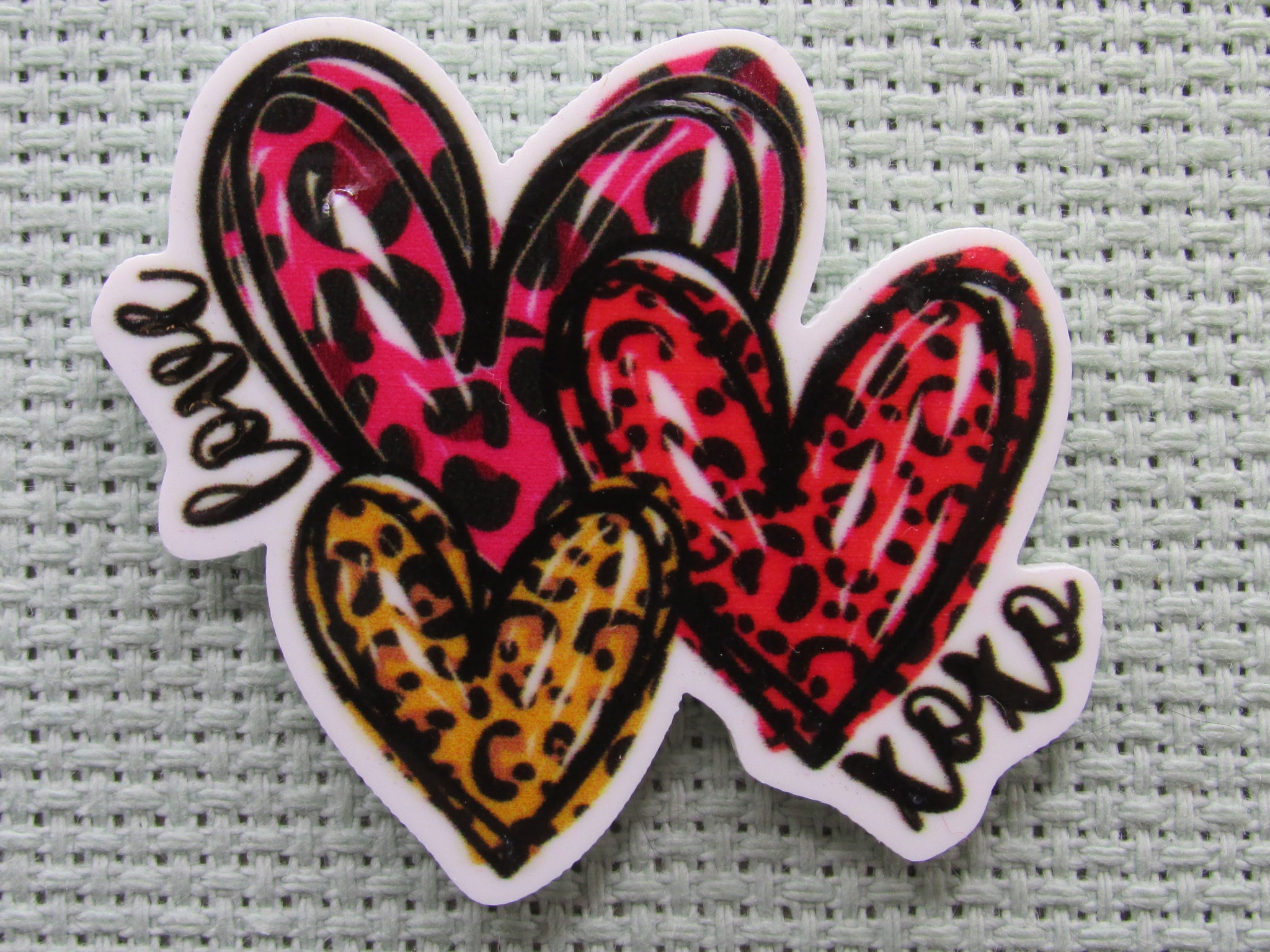 Red, black and animal print make up these hearts with the words "love" and "xoxo".