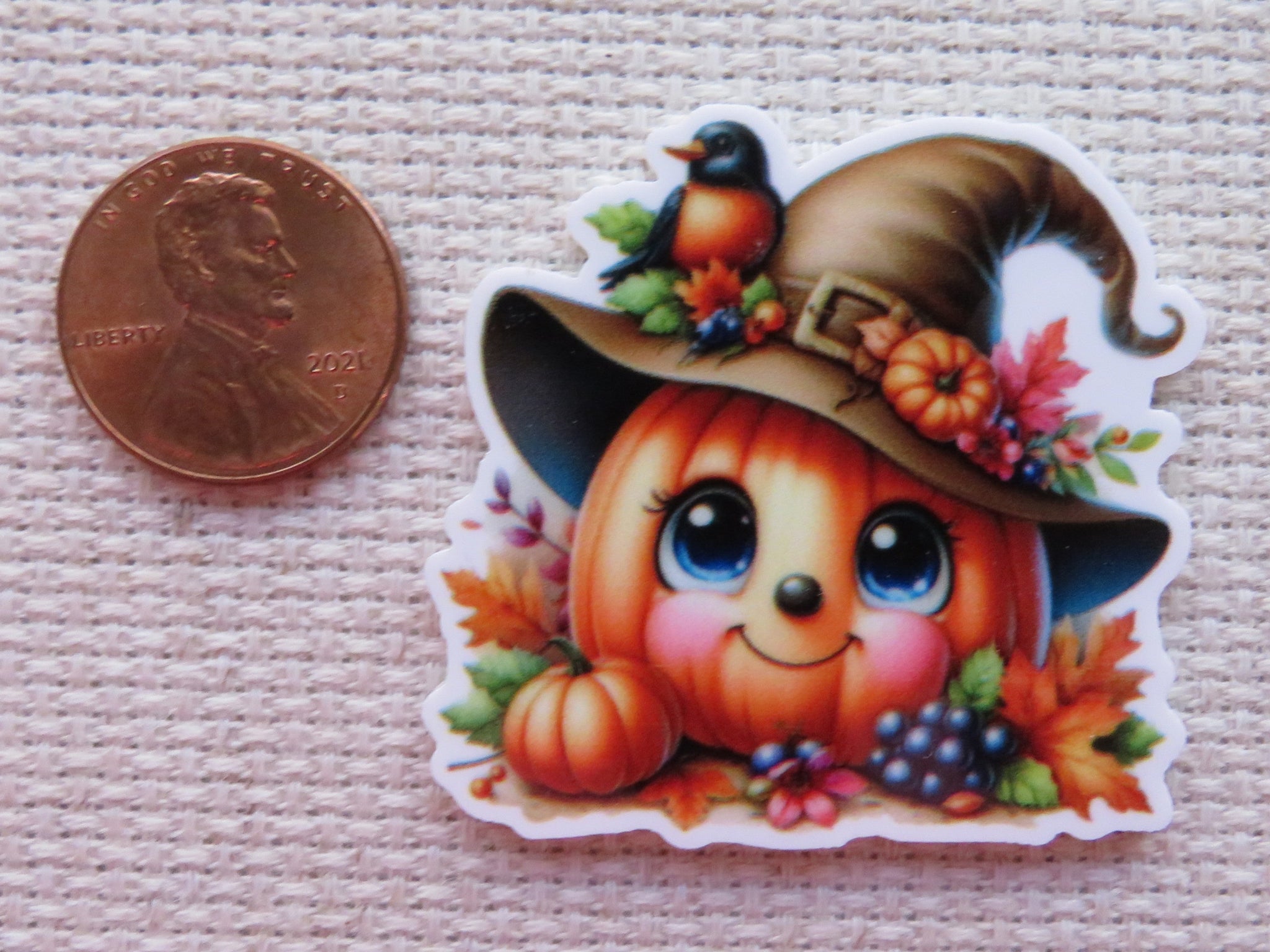 Adorable cartoon pumpkin with festive Fall decorations and a cute robin sitting on the hat.